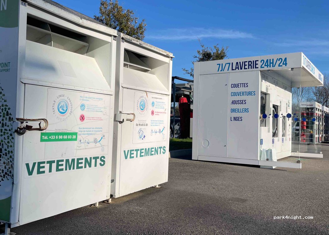 Automatic laundry and drying next to the service station which also sells gas in 24 hours payment by credit card also a pizza distributor next door. opposite burger king. and supermarket and Bricomarché.