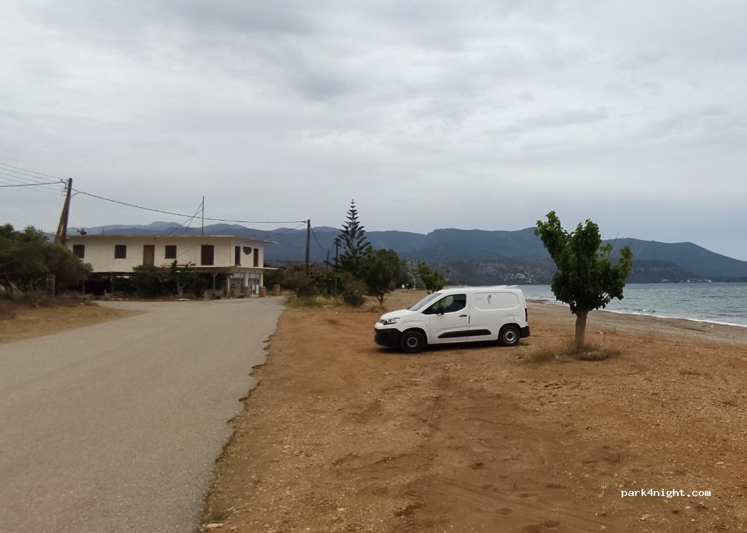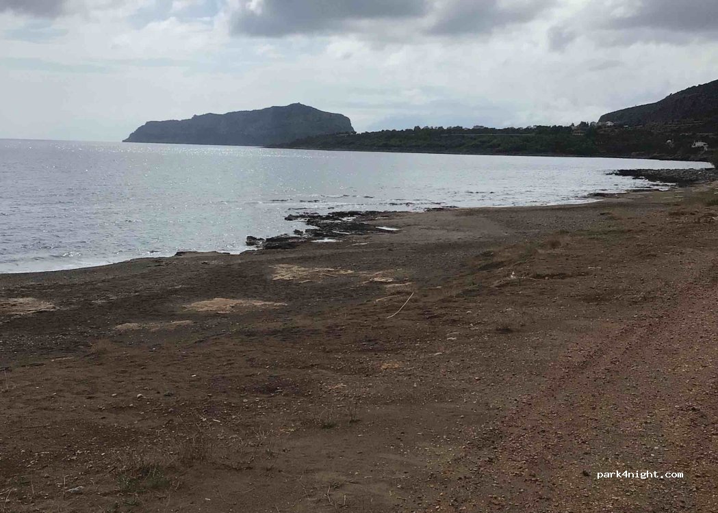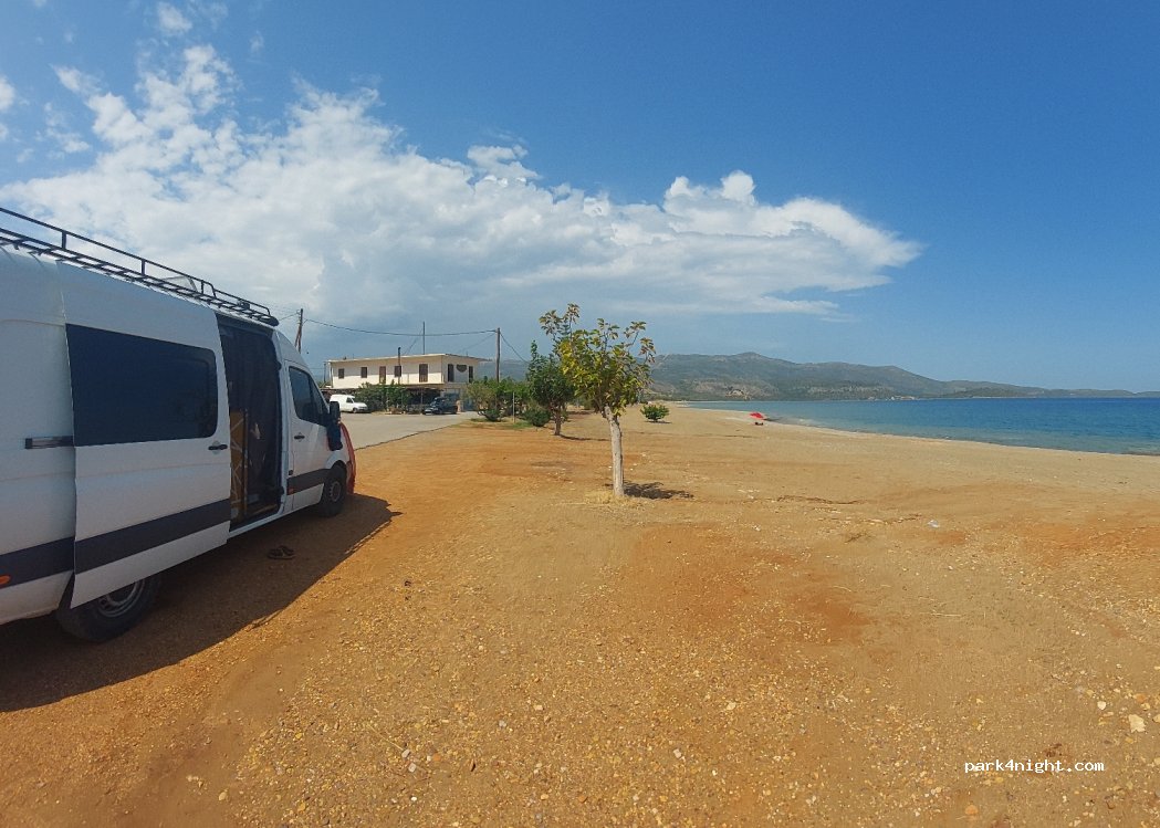 Very good spot on the beach with a view of Monemvasia in the distance. Several flat spots along the road. (Nobody drives on this road except people who come to the beach) Super simple access, very very little frequented (less than 10 people on the whole beach on 08/31) Nearby: shower, toilets and water pipe, police car drove by during the day but didn't say anything
