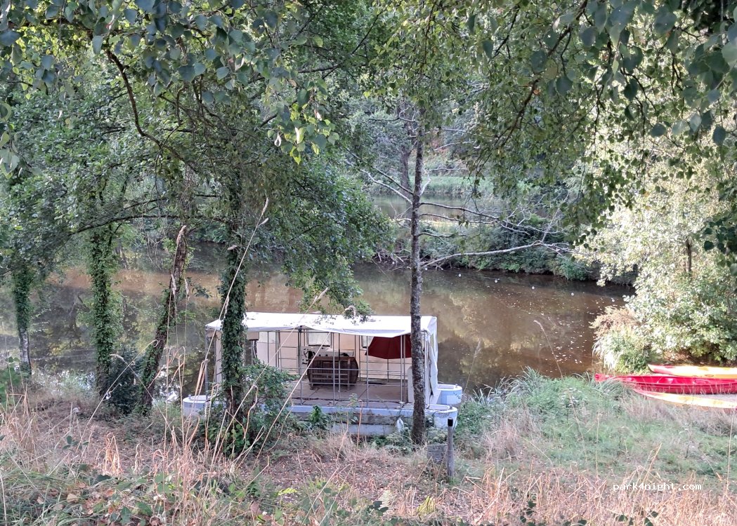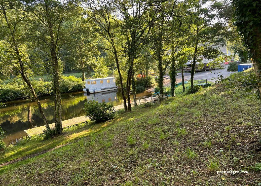 On the edge of the Nantes to Brest canal, swimming pool next door, guinguette, car park located before the CC area, no restrictions on this car park unlike the one further away. Quiet and shaded, tables under the trees.
