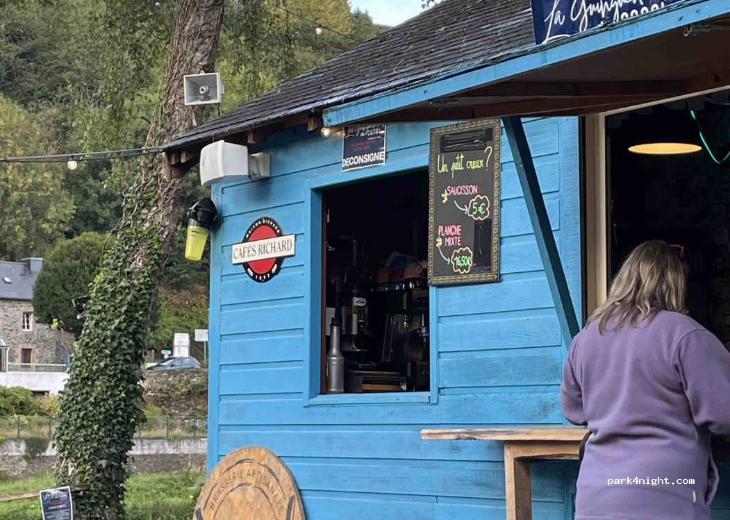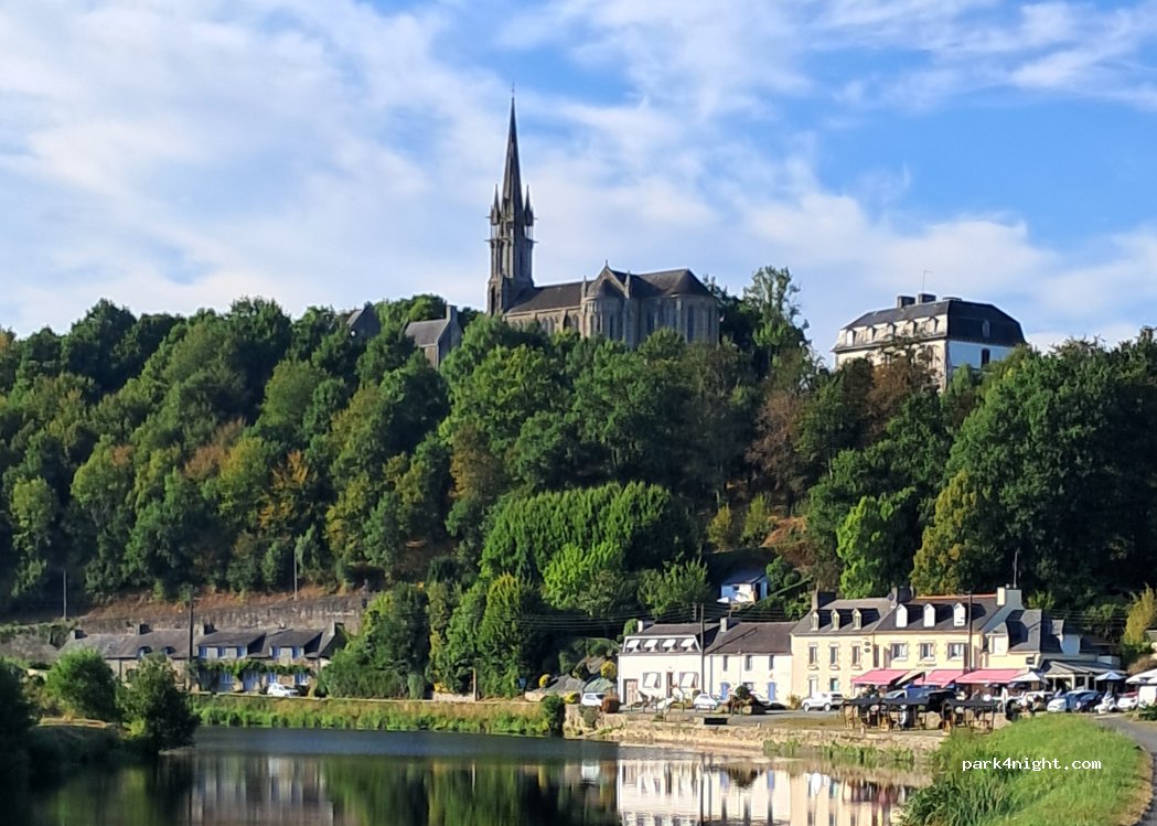 Sur le bord du canal de Nantes à Brest, piscine à côté, guinguette, parking situé avant l’aire de CC, pas d’interdiction sur ce parking contrairement à celui qui est plus loin. Calme et ombragé, tables sous les arbres.