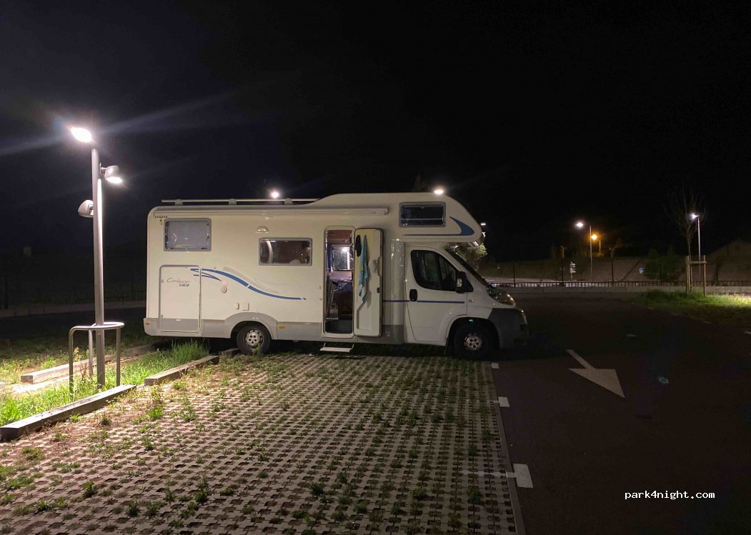 Grosser Parkplatz mit Beleuchtung. Platz für mehr als 10 Mobile. liegt zwischen 3 Straßen aber für eine Übernachtung sehr gut. Keine V E. Wir standen mit ca 10 Mobilen da