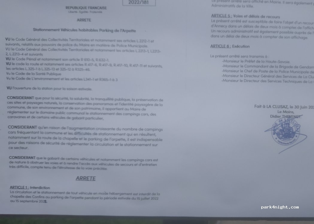 Il est interdit que du 15 juillet au 15 septembre le jour. voir copie photo de l'arrêté affiché au dos du panneau. Sinon parking pour le départ des randonnées. interdit la nuit toute l'année depuis 2025