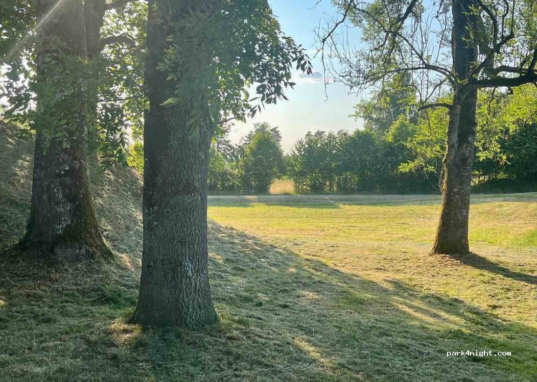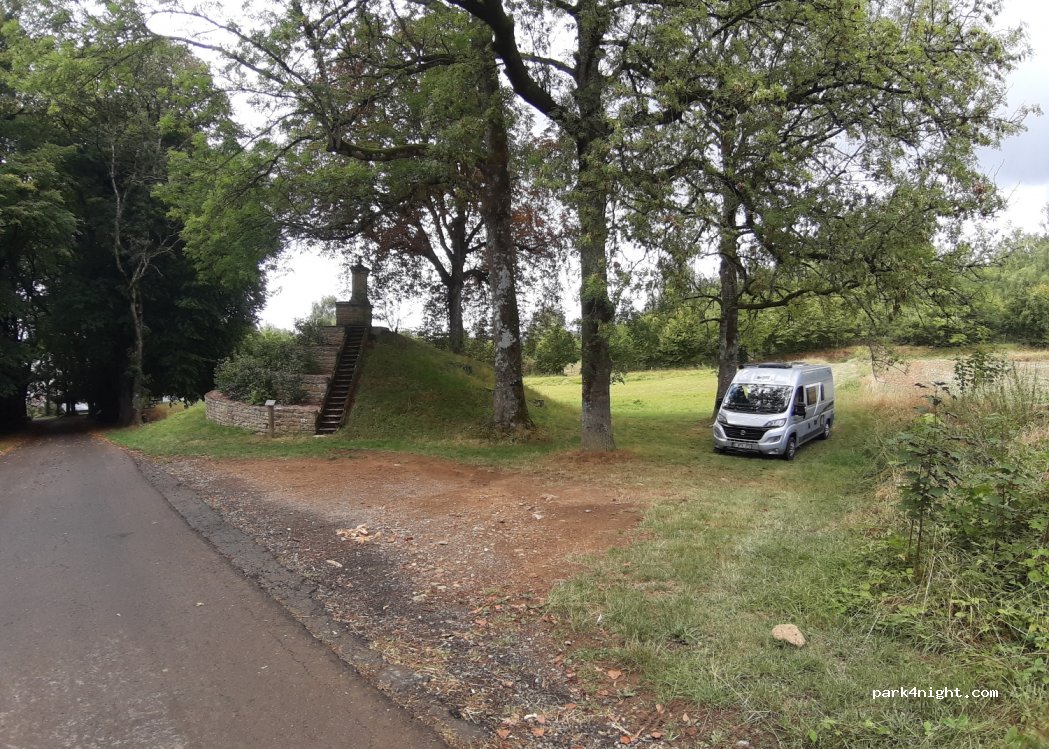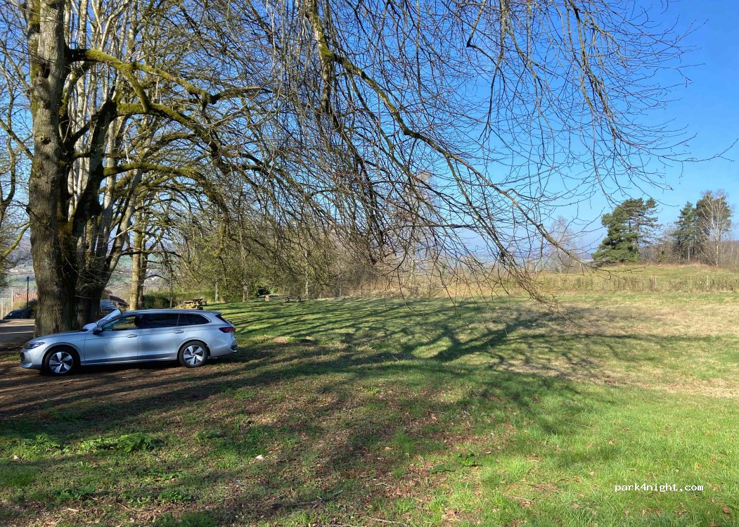 Zalige plek in de natuur! Als het droog is kan je op het gras rijden en staat de camper ongeveer vlak. Erg rustig, mooi uitzicht, genoeg plaats voor nog enkele andere kampeerders die er waren. Ideaal vertrekpunt voor wandelingen in het bos en de velden. Picknicktafels en vuilbakken aanwezig.