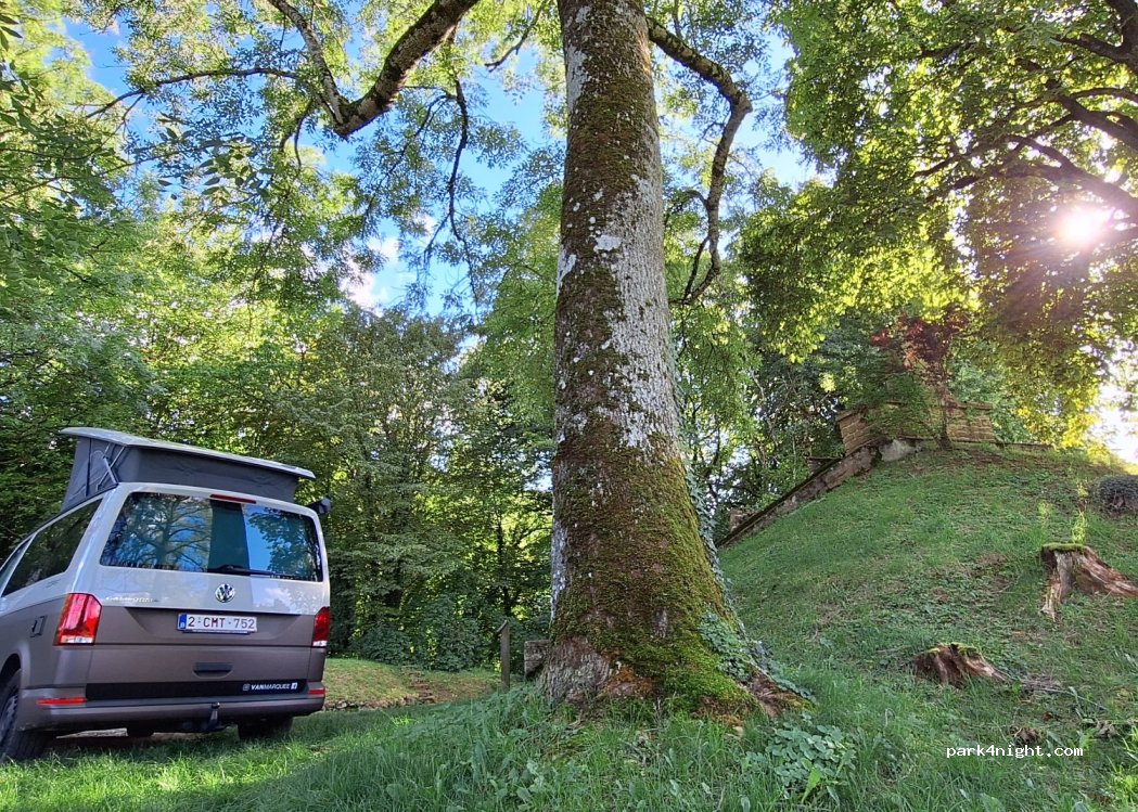 Very quiet place under the trees, during the day only very occasionally a car passes (road ends in the woods). Silent as a mouse at night, only the calls of some tawny owls. Near the beautiful chapelle de l'Ermitage and within walking distance of the beautiful village of Torgny. Picnic benches and rubbish bins 100 m away.