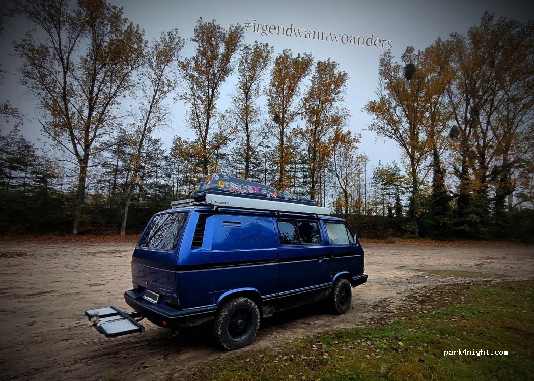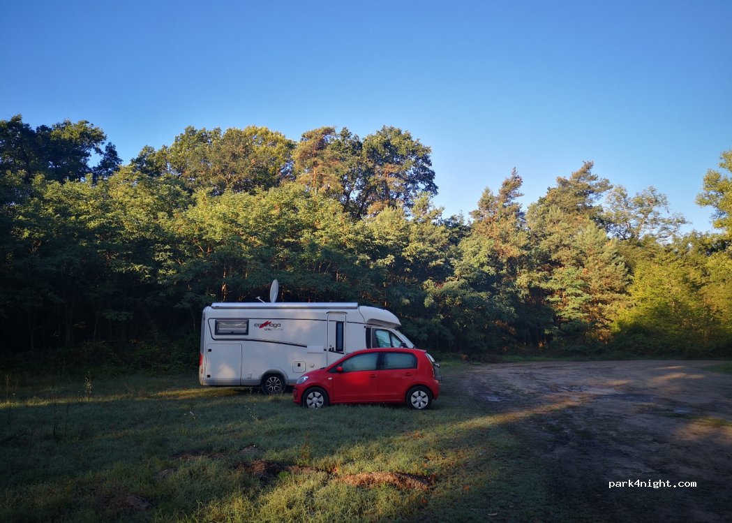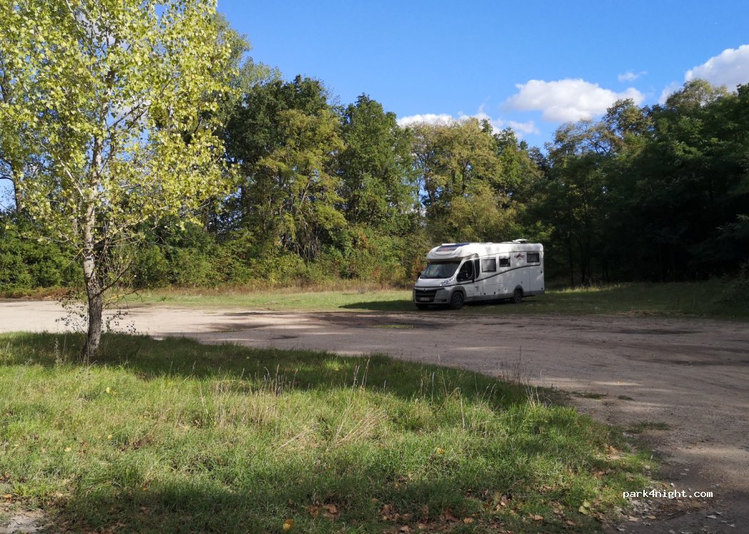 Sehr schöner Stellplatz, fester Kies und Sandboden, das bisschen angrenzender Wald ist sehr schön, wir könnten ohne Probleme hier übernachten, es gab auch keine Pfütze da es sehr warm und trocken war. Am Morgen kamen noch ein paar nette Hundehalter um spazieren zu gehen.