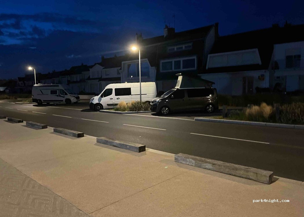 Nombreux stationnements en épi. Point d’eau, WC (autonettoyant) et assise avec table à proximité sur la promenade le long de la plage. Circulation et bruit modérées la nuit. Le tout à 20 minutes à pied du centre. Je recommande (pour un van).