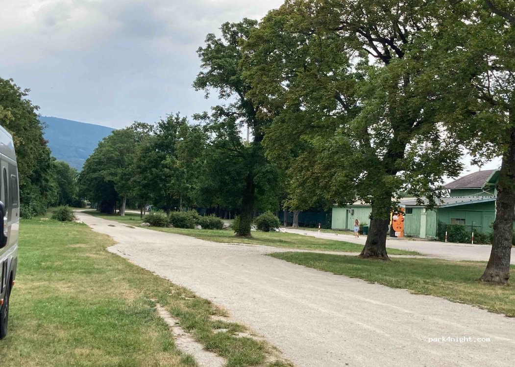 Grand parking entre l’hippodrome et le stade de foot. Beaucoup de places, ombragées. Poubelles à disposition. Proche de la jolie ville de Baden et de ses commerces. Les thermes sont à voir ainsi que les jardins. En transit pour Vienne. En cas de courses hippiques, on ne peut pas s’y installer. Laisser l’endroit propre.