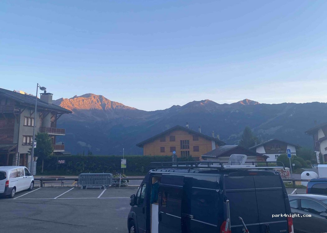 Free parking for 48 hours. Located in a small parking lot next to the sports center. Quiet at night, trash cans available even for recycling, sports center 30 seconds walk, town nearby, grocery store 5 minutes walk, no toilets, incredible views, excellent mountain biking, don't forget to pay your tourist tax at the tourist office - you will get many benefits that are worth it (it's also the law). Be clean and calm and respect the locals! People can park while respecting the parking time but cannot sleep there.