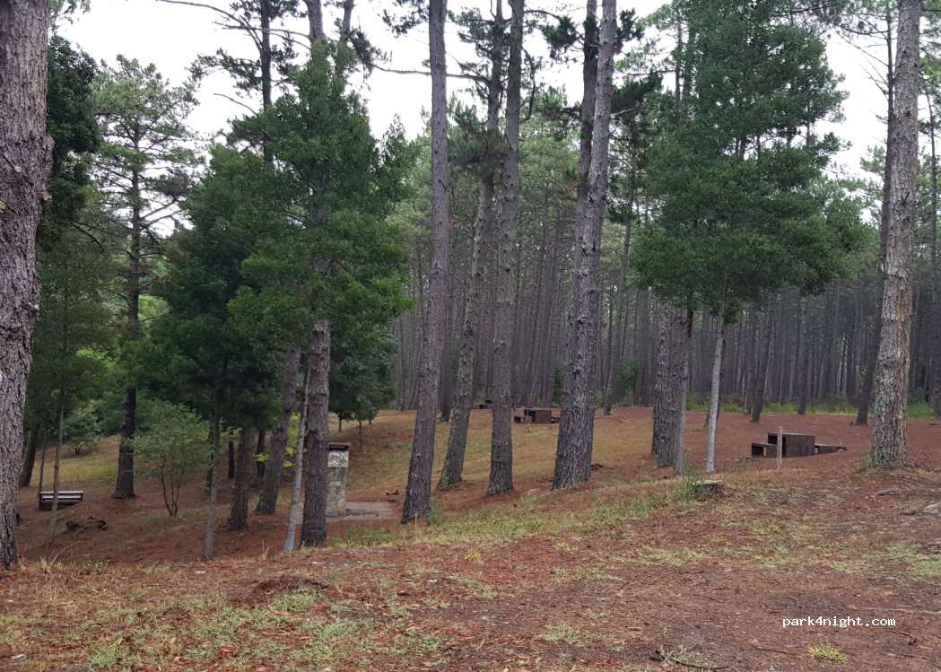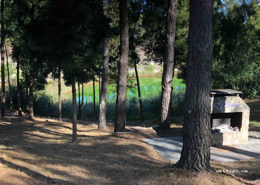 Einsam in einem Pinienwald gibt es einen kleinen See mit Tischen, Mülltonnen und Grill. Der Stellplatz liegt am Rande einer nachts nicht befahrenen Forststraße