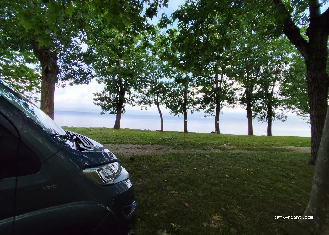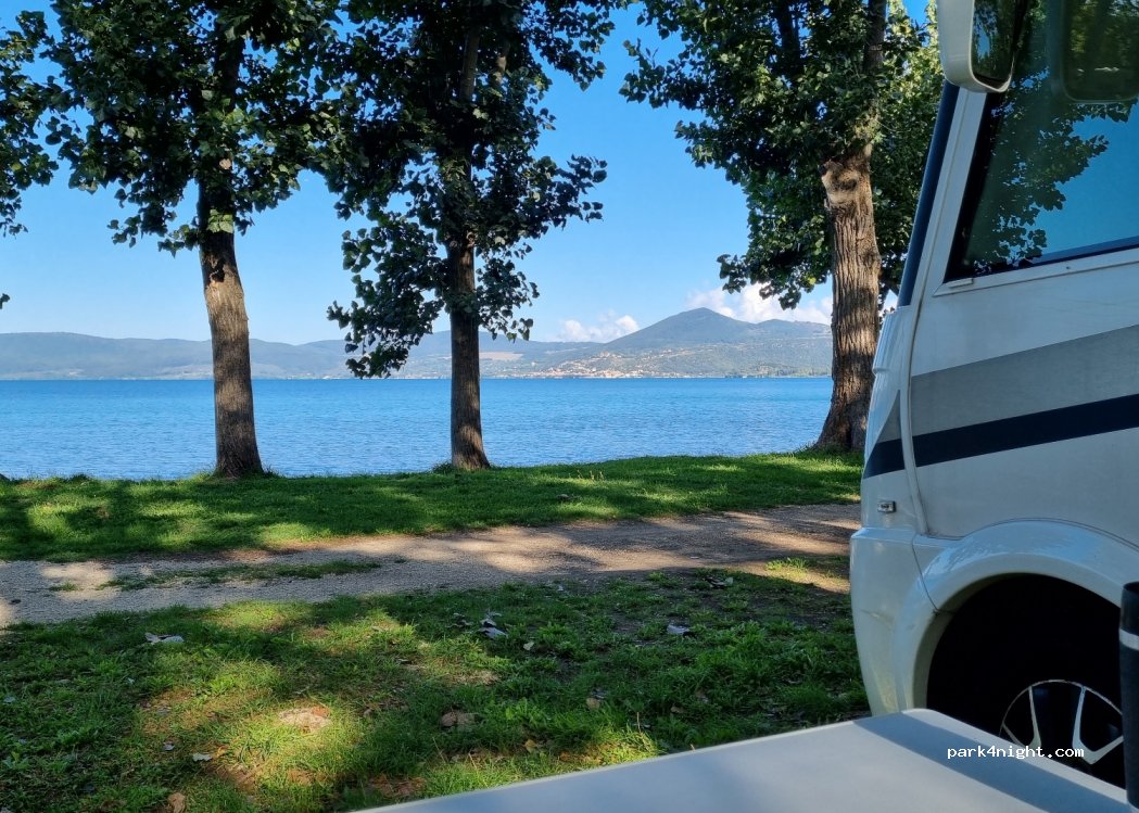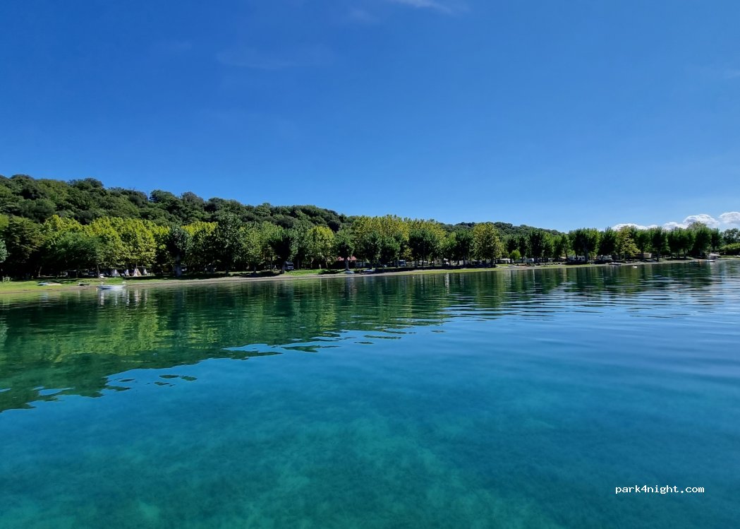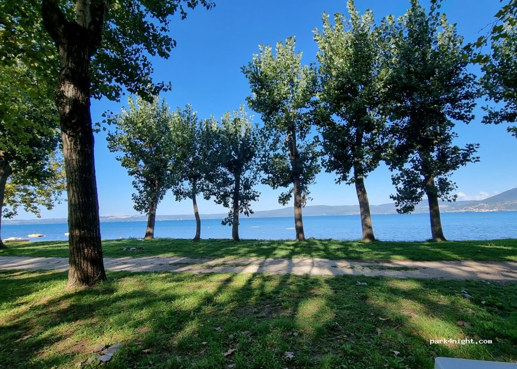 Campsite Parco del Lago. Very nice campsite right on the lake. Beautiful beach and great evening sun. For us the most beautiful place on the lake. Pitches by the water. Not as shady as the pitches in Bracciano. Street a little louder, but little traffic. Small restaurant in low season only on weekends. Shallow beach.