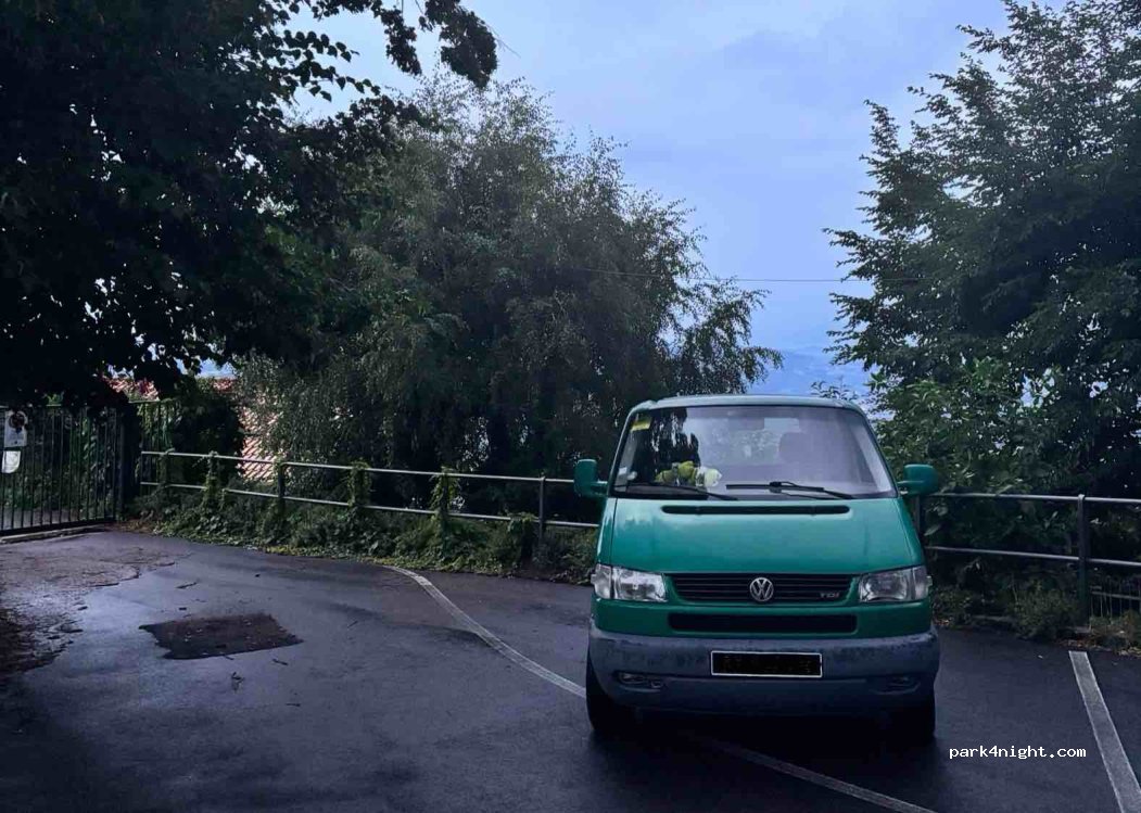 Parking (env. 15) dans une installation sportive. Impasse donc très calme. Pas exactement. Accessible uniquement en van. rues très étroites. Un restaurant juste à côté.
