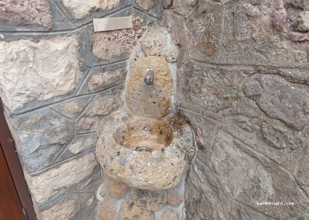 Hier gibt es einen Trinkwasserhahn und öffentliche Toiletten, es gibt keinen Anschluss, um einen Schlauch anzuschließen, und Sie müssen die ganze Zeit den Knopf gedrückt halten, aber es hat einen guten Wasserfluss. Auch hier gibt es einen kleinen Parkplatz, der für Vans geeignet sein könnte.