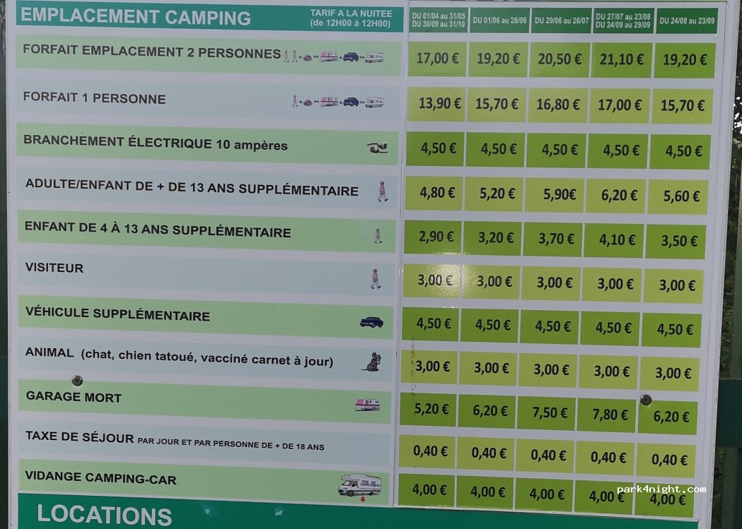 1 emplacement, 2 véhicule, 4 adultes, 40€ avec électricité. Sannitaire très propre, emplacement grand mais peu d'ombragé et non séparer les uns des autres. Idéal pour une nuit. Proche du centre. Un peu cher au vu qu'il n'y a aucune activité internes.