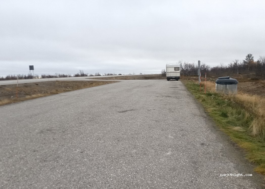 A parking lot on top of a hill with a view far into the horizon. Super good place to watch the northern lights. The nearest institution is 30 km away. Little traffic, peaceful stay.