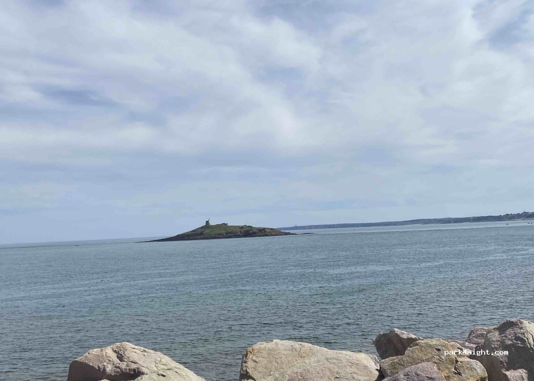 parking assez grand avec vue directe sur la mer et L'îlot de la chapelle Saint-Michel, accessible à marée basse. stationnement de jour uniquement comme sur toute la commune ,réception 4G OK j