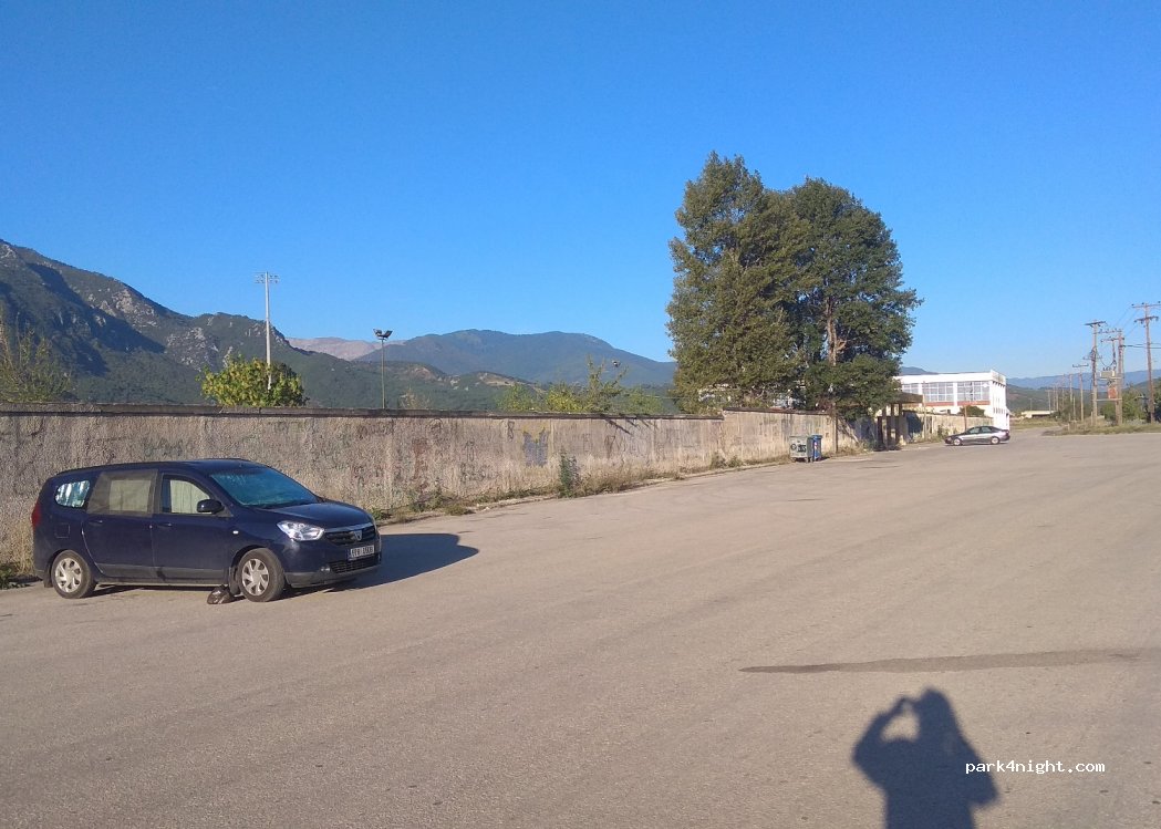 Parking plat à côté du stade. Environnement pas très glamour, mais assez loin de la route, donc pas de bruit la nuit. Le matin, plusieurs camions passent à côté. Deux poubelles à disposition. Cela fait bien l'affaire pour une nuit.