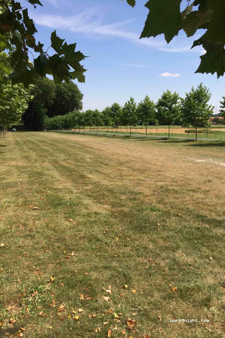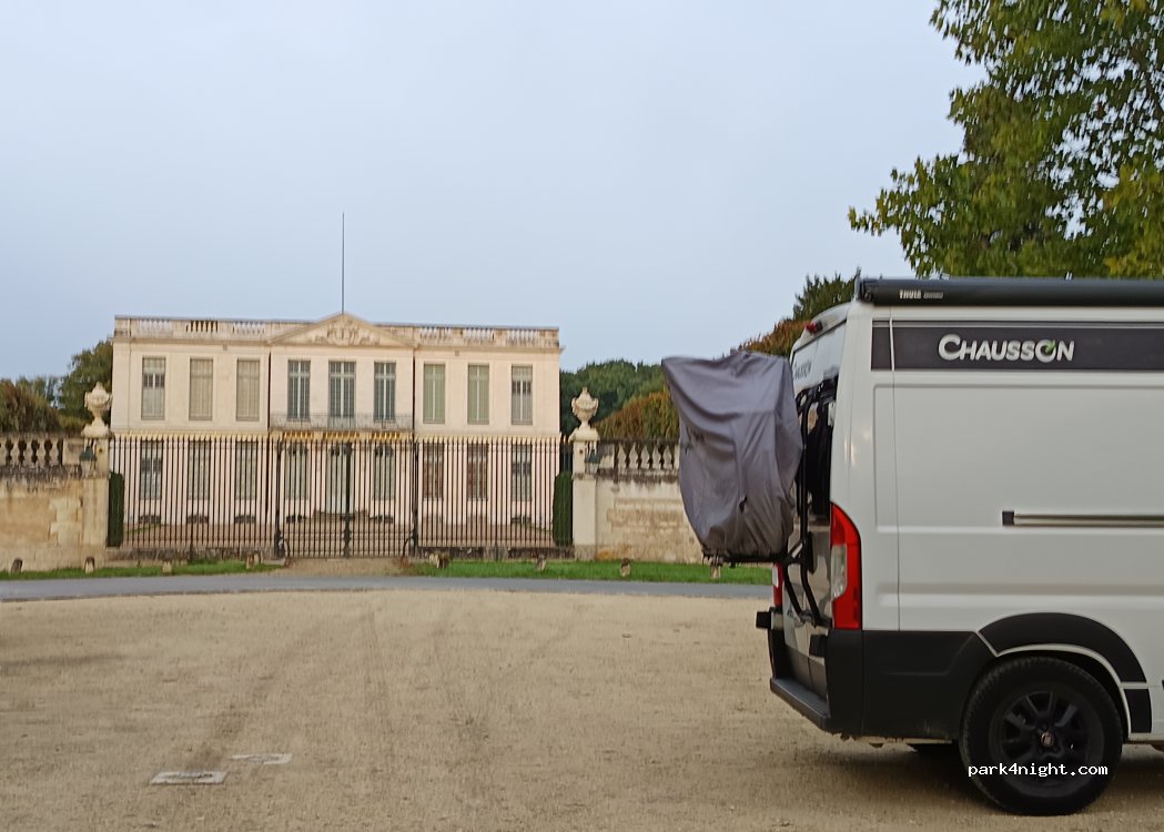 Très grand parking plat herbeux et ombragé, nuit très calme les face au château à visiter sans hésitation très belle restauration et immense parc N