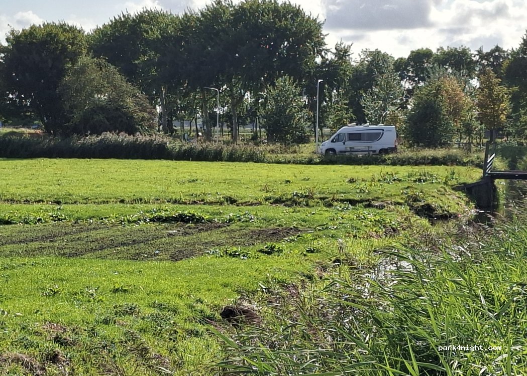 Piccolo parcheggio sterrato al bordo di una strada poco trafficata. Nonostante sia sulla rotta degli aerei che atterrano ad Amsterdam, la notte è molto tranquilla. Nessun divieto.