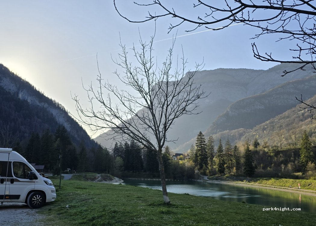 Great spot, quiet overnight. Meadow area with tables. Short walk into Thônes along the river, nice place, has everything. Re-cycling on site. Lots of walks for all abilities. Bakery across the road. 48 hours stay limit. A dozen parked there mid-week. Easy drive from Annecy if you want to extend stay in the area and change from a campsite. Definitely recommend.