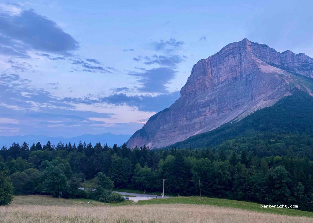Nous avons passé la nuit sur ce parking avec belle vue sur le Mont Granier. Route quand même assez passante mais pas de quoi perturber le sommeil.