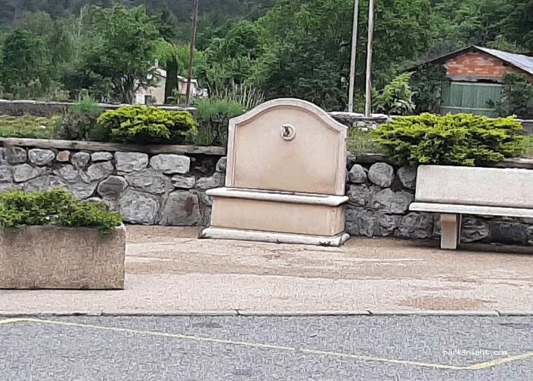 Fontaine au bord de la route devant les arrêts de bus. Possibilité stationnement parking à proximité. Bon débit de l’eau.