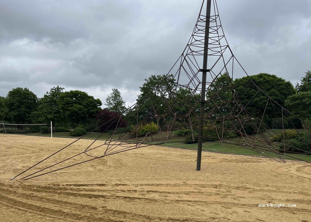 Parking near a wooded park. Large parking lot with many parking lots to be away from each other. A dozen picnic tables. A playground for children, ping-pong tables and garbage cans available. The toilets are located in front of the ping-pong tables, at the back of a small wooden cabin with porthole-shaped windows.