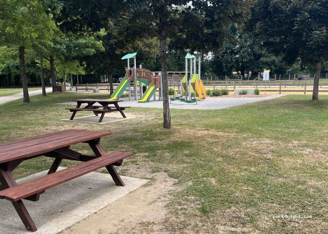 Parking aux abords d'un parc arboré. Grand parking avec de nombreux stationnements pour être à l'écart des uns des autres. Une dizaine de table de pique-nique. Une aire de jeux pour les enfants, des tables de ping-pong et des poubelles à disposition. Les toilettes sont situés en face des tables de ping-pong, au dos d'une petite cabane en bois avec des fenêtres en forme dhublot.