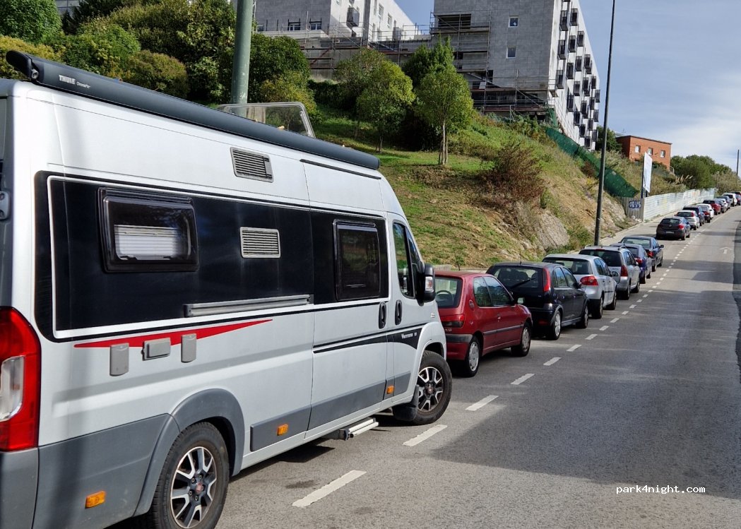 Zona muy tranquila, se puede pasar la noche, mi AC mide 7,5m, se llega al centro en 20 minutos(con niños) para volver hay autobuses, es más, hay una línea que funciona 24h, hay un parque y una fuente, la zona verde los fines de semana y a la noche está exenta de pago