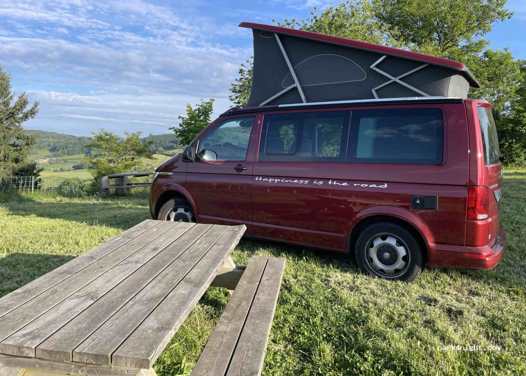 tres bel endroit avec une vue a 360* manque vidange pour eau grise et cassette (dommage ) table et toilette a disposition Madone éclairée le soir bravo la commune depot de pain a l épicerie et resto a 300 mts nuit tranquille