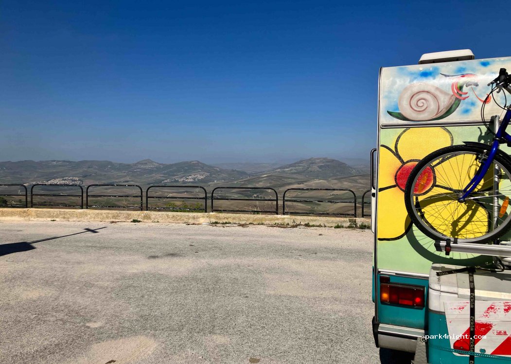 Ebener geteerter Platz, ohne jegliche Verbote. Eine atemberaubende Aussicht auf das Belice Tal. Umrundet von den Trümmern der ursprünglichen Ortschaft welche 1968 durch ein Erdbeben komplett zerstört wurde. Im Dorfkern befindet sich das “Gattopardo-Museum” zum gleichnamigen Roman und zum Viscontis Film. Der Film, ein Musst wer Sizilien verstehen möchte. Zum Übernachten ist dieser Platz ideal.