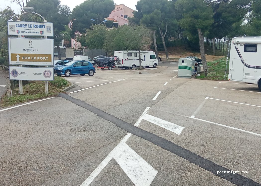 Juste a l,entrée de carry le rouet .Pratique pour stationner la journée, éventuellement y dormir une nuit.Prévoir 20 minutes pour arrivée au port à pieds, se faire un resto (à éviter Le Fernánd,elle !!) se balader le long du sentier qui longe la falaise à droite en arrivant au port Pratique et on ne risque pas de PV la gendarmerie jette un œil de temps en temps.C , est pas le top mais il existe