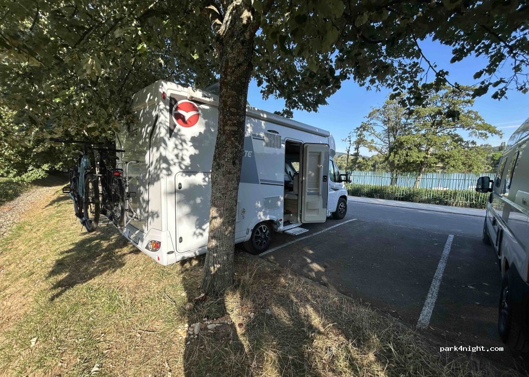 Parking of about thirty spaces facing the lake (nautical base), rather quiet at night. There is even an automatic and free public toilet. Bins and picnic tables all along the trail around the lake (cycling/walking/running). No parking ban sign at night or camping car.