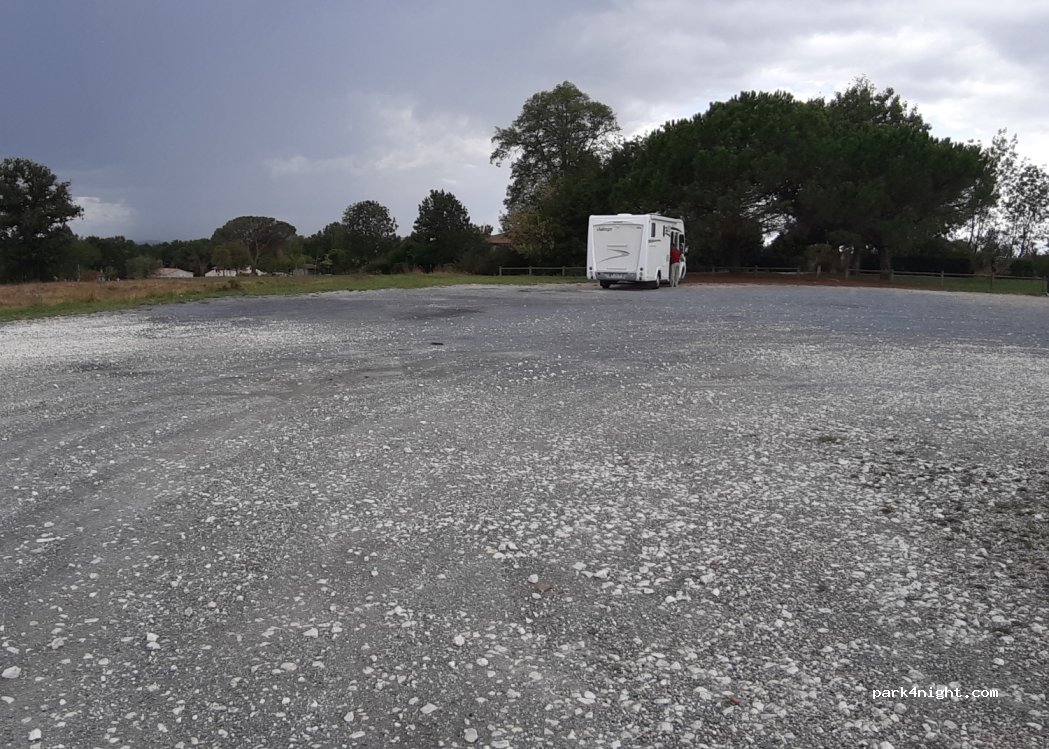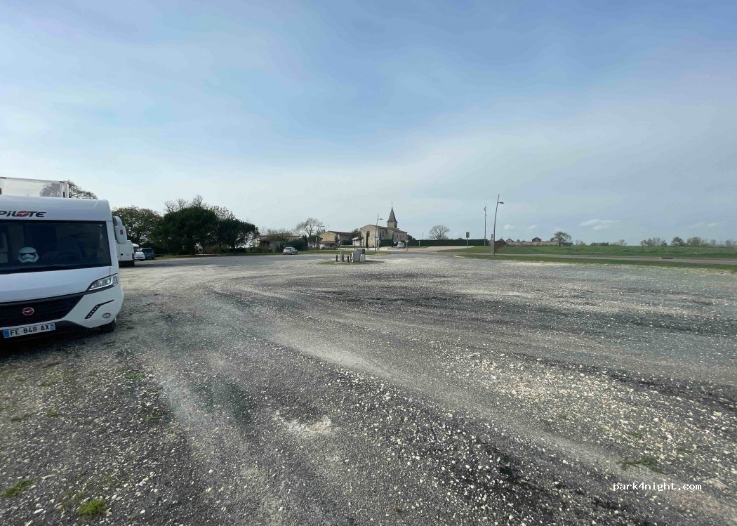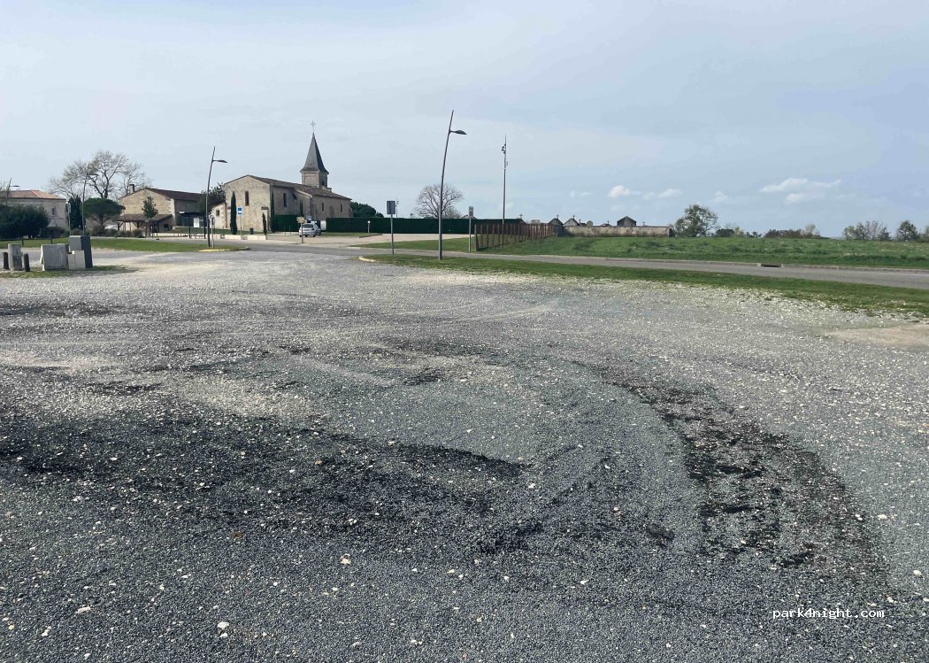 Parking avec gravillons relativement plat et assez vaste. Manœuvres possibles pour les grands gabarits. Cependant panneau indiquant une interdiction aux poids lourds. Un peu ombragé aux abords avec grands espaces pour se dégourdir les jambes ou pour un pique-nique dans les herbes. Bar Tabac Épicerie à quelques pas. Pas mal pour une pause déjeuner. Nuit possible (aucun panneau ne l’interdit) malgré le passage fréquent en journée sur la route départementale située à une 50aine de mètres.