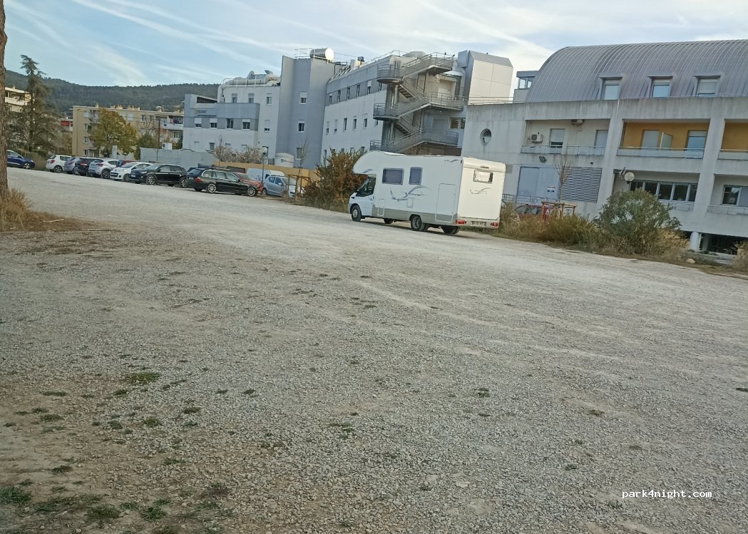 Large flat lot accessible to all. Opposite the Intermarché. Very quiet for the night. 10 to 15 seats.