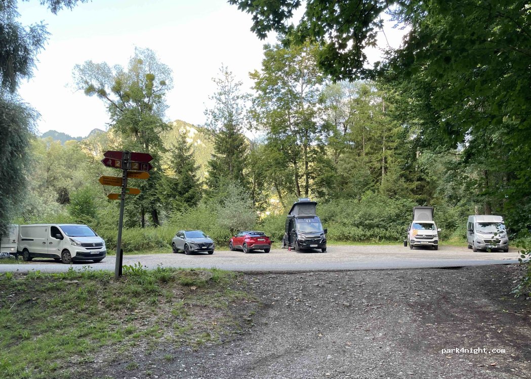 plusieurs places de parking en terre (plat). deux grandes tables de pic nique. au bord du important cours d'eau emavec une belle vue sur la montagne. le spot est le long d'une petite route étroite mais ça passe avec notre CC de 7m. au milieu de la forêt mais on entend le bruit des quelques voitures qui passent. top pour une nuit ou deux