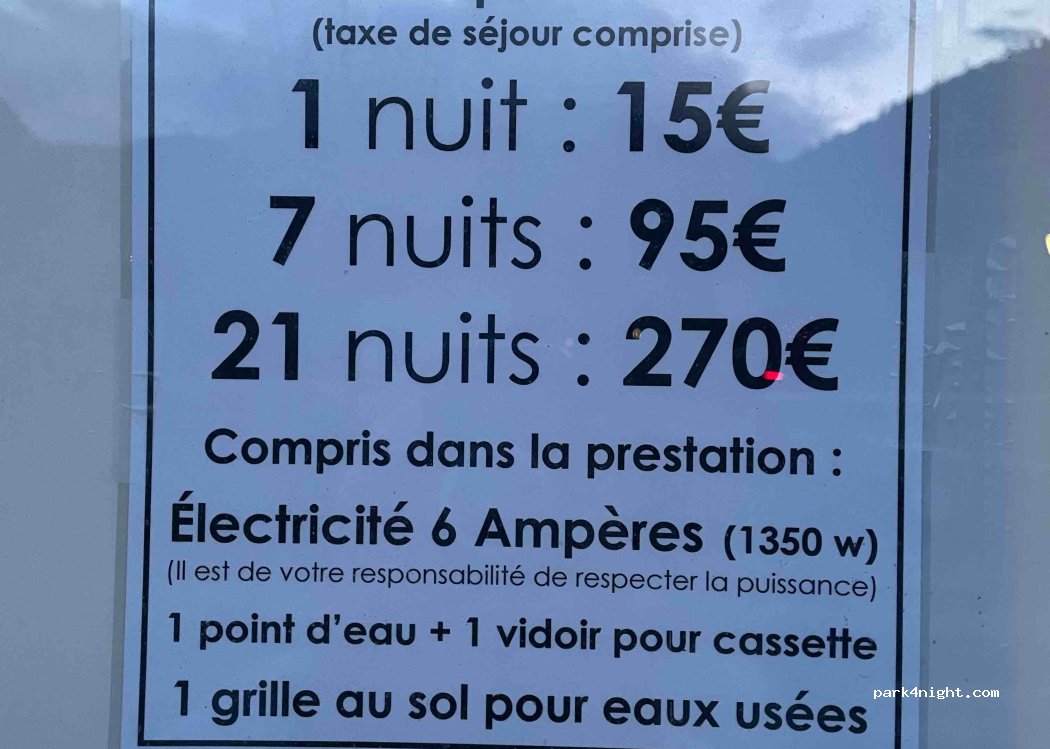 Prix des services inclus dans les 15€ il manque juste l’indication qu’il n’y a pas d’accès aux sanitaires (douches / toilettes), impossible aussi d’acheter un jeton d’accès qui sont réservés aux clients du camping. Le rapport qualité /prix n’y est pas ? la prestation proposée par rapport au prix à la journée est décevante en comparaison à d’autres aires dans un rayon de 25km. Éviter cette aire de camping car à l’avenir me paraît être une évidence.