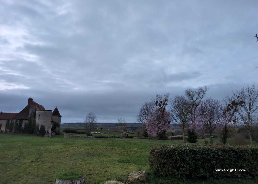 Parking avec vue sur le château. Nuit calme. Le pain et les croissants du boulanger ,qui est sur le parking,sont excellents