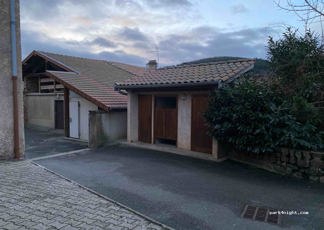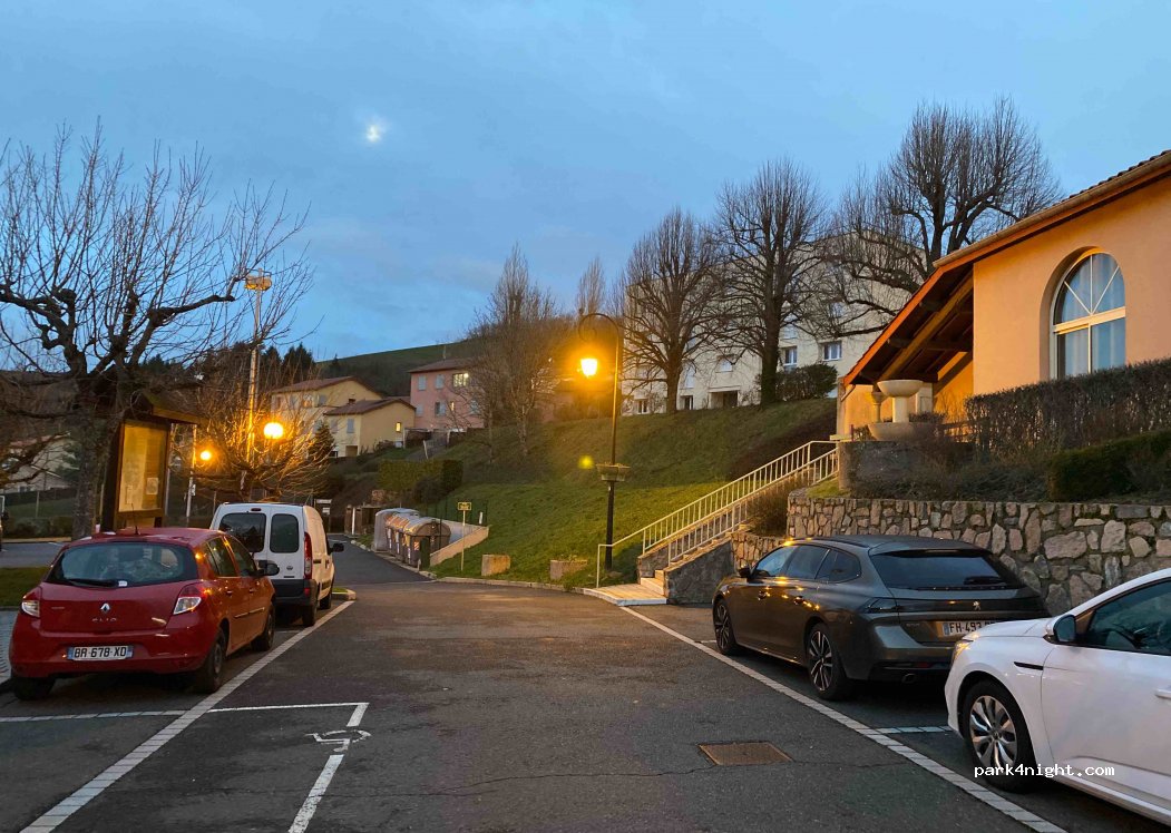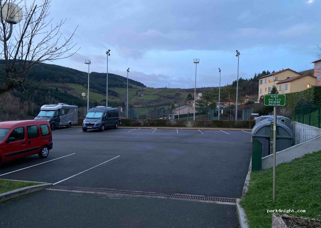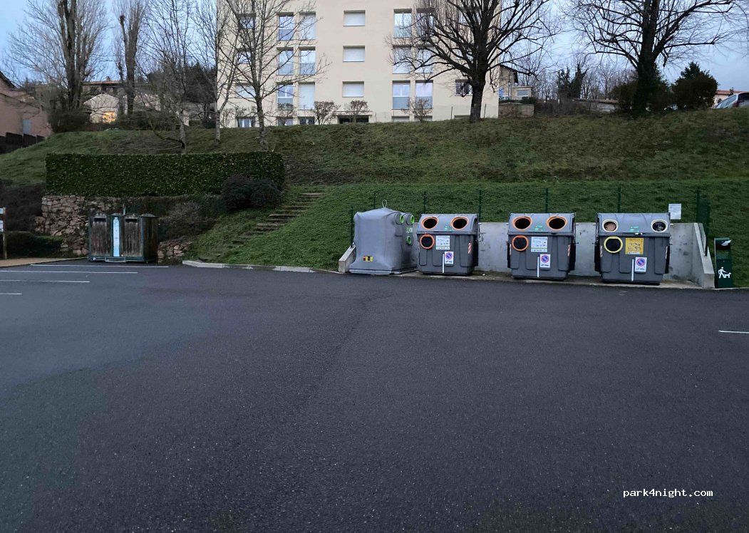 Petit parking de la salle des fêtes, très calme. A plat, terrain de boules public, tri des poubelles sur place. Merci pour cet emplacement!