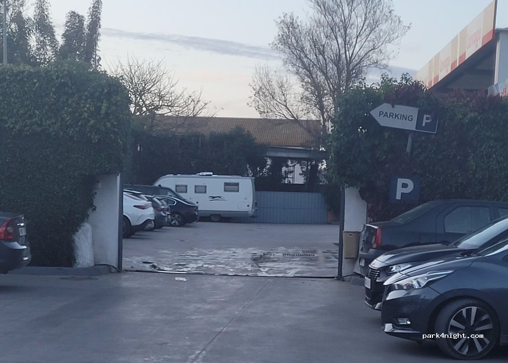 Impossible de dormir sur la côte, on m'a dirigé à cet endroit. Ça peut ne pas payer de mine sur papier mais j'ai été agréablement surpris! Petit parking derrière la station service entouré de murs et de plantes, propre, en sécurité et au calme le temps d'une nuit (personne ne passe la nuit la porte est fermée aux véhicules), ça dépanne bien. Un peu bruyant mais c'est ok. Resto et toilettes.