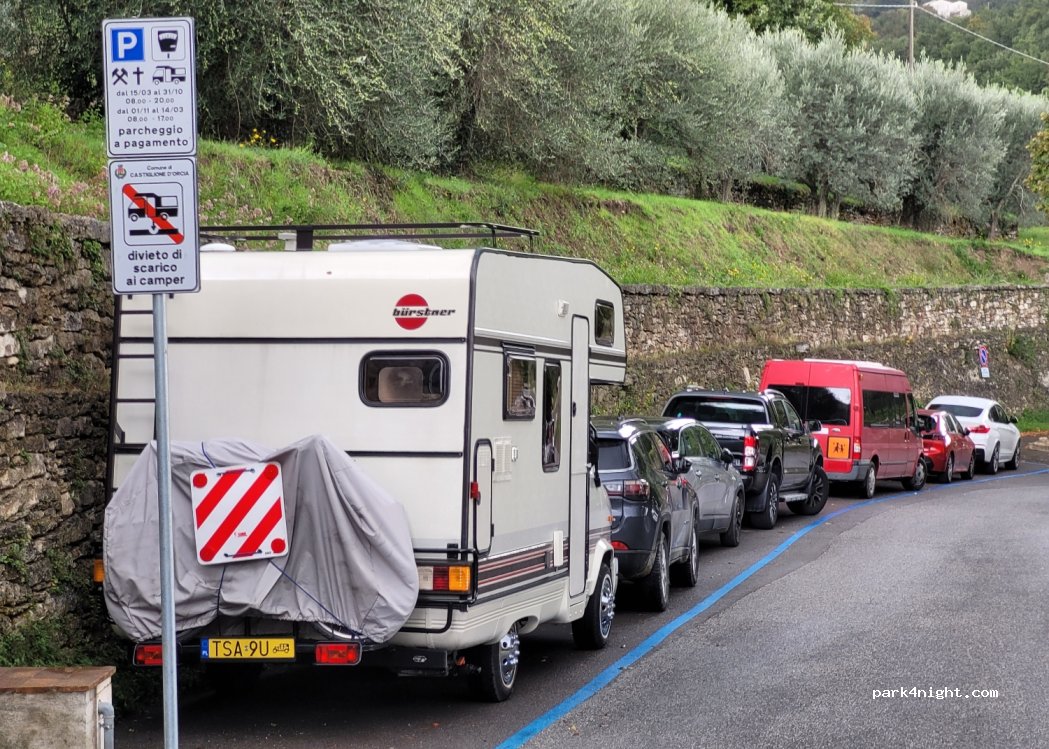 Si parcheggia nelle linee blu lungo la strada. Strada tuttavia molto tranquilla e di notte non passa nessuno. Attenzione di arrivare verso sera per la notte o mattina molto presto. Alle 09.30 é già pieno di macchine. 10 minuti dai bagni che si raggiungono tramite un sentiero di sassi. Parcheggio senza nessun servizio. Pagare alla macchinetta con tariffa camper (15€.) dalle 08.00 alle 20.00. La polizia municipale passa più volte al giorno.