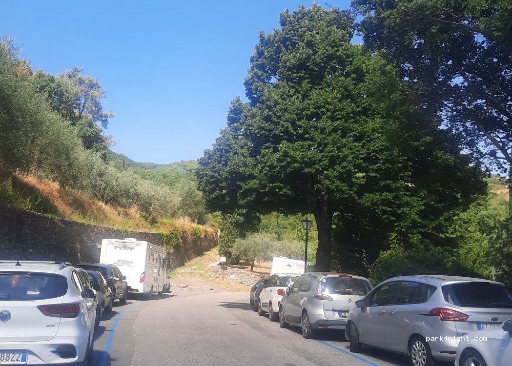 Abbiamo parcheggiato qui perchè seguendo le indicazioni in paese, ci dava come unico punto dove posteggiare camper. Purtroppo è un parcheggio lungovia che non ha molti stalli e 2 di questi erano occupati da auto. Di buono c’è che se trovi posto sei a 5 minuti dal paese e dalle piscine che comunque si pagano. Ovviamente il parcheggio è a pagamento con parchimetro poco distante.