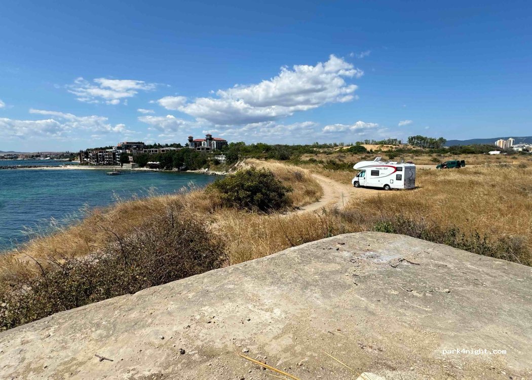 Forme de parking non standardisé, accès possible au poids lourd. Pour le passage au début il y a des herbes qui frottent très légèrement les parois et la route, le chemin, est bosselé, il faut rouler doucement mais c'est accessible à tout véhicule. accès à la plage côté free, suivre les locaux. Possibilité d'aller visiter la vieille ville de Nessebar à 30 minutes à pied en passant par la plage!