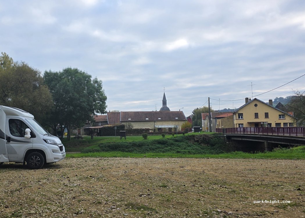 Parking plat caillouteux compacté, Aucun service, mais c’est annoncé, Endroit délicieux en surplomb de la rivière La Chiers, Le petit village a le charme attachant de ceux en pleine campagne, d’autres personnes estimeront que cela ne doit pas être facile d’y vivre à plein temps