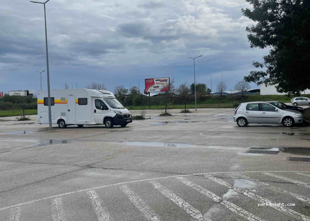 Parked there to spend the night but a beggar came and was insistent for money for food, didn’t leave until we gave him some crisps so he left, we were alone so we went to the other spot in the city where there was more campers and felt much safer. No toilet, no water, no electricity, just a parking lot behind a shopping center.