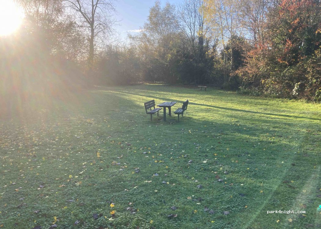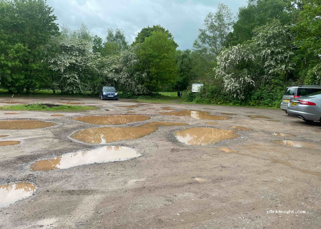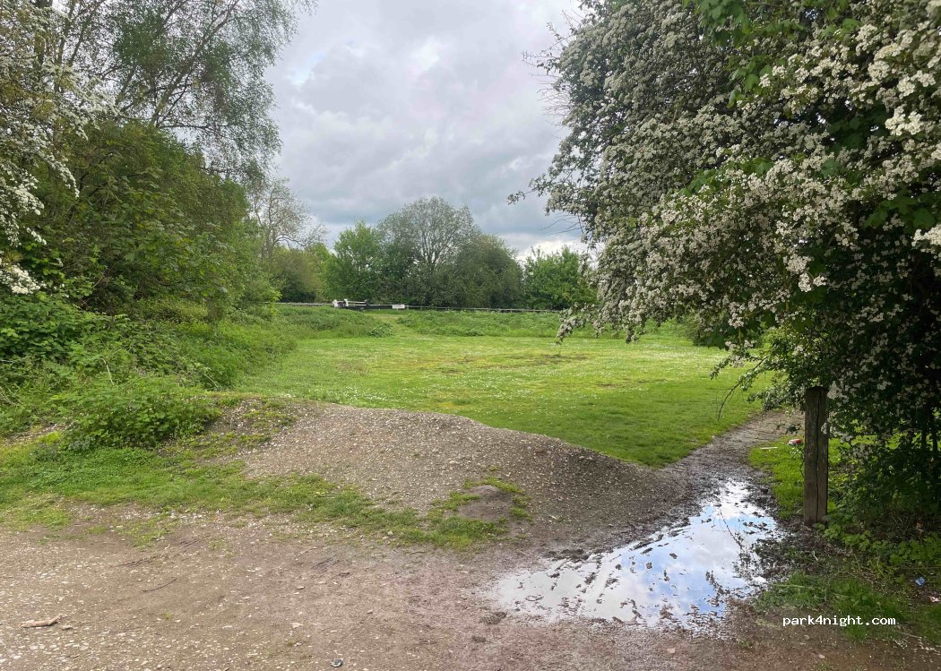 Nice dirt car park with picnic tables and walks along the canal and the lakes. 2.1m height restriction, and barrier is never closed. Uneven surface but easy to get level. Suitable for overnight stays but some late night and early morning visitors. A bit of noise from nearby trains and motorway.