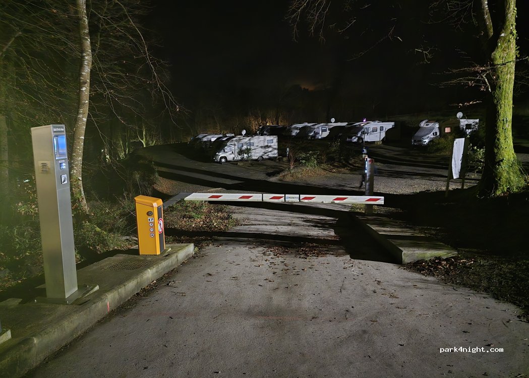 Aire du réseau Aire Park, tarif hors saison 11,20€ tout compris. Bien située pour visiter le village de Rochefort. Stationnement sur deux niveaux. Le niveau situé en contrebas se situe à proximité de grands arbres, attention au risque de branches qui cassent quand le vent souffle fort…