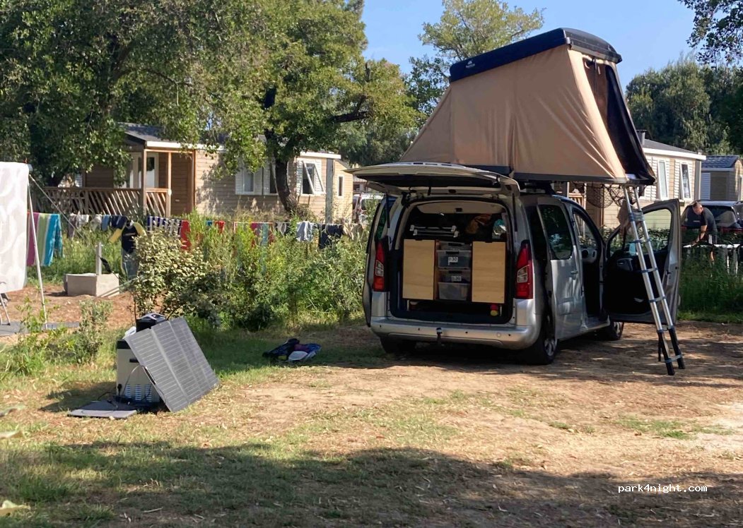 Nous y avons passé une nuit. A une 30 de min de la citadelle/ville et a 10 min a pieds de la plage Très bon accueil, sanitaires neufs et propres. Emplacements bien délimités et du fait de la fin de saison très peu de monde. 19 € pour 2 adultes et un van. vidange et recharge en eau gratuite Epicerie abordable.