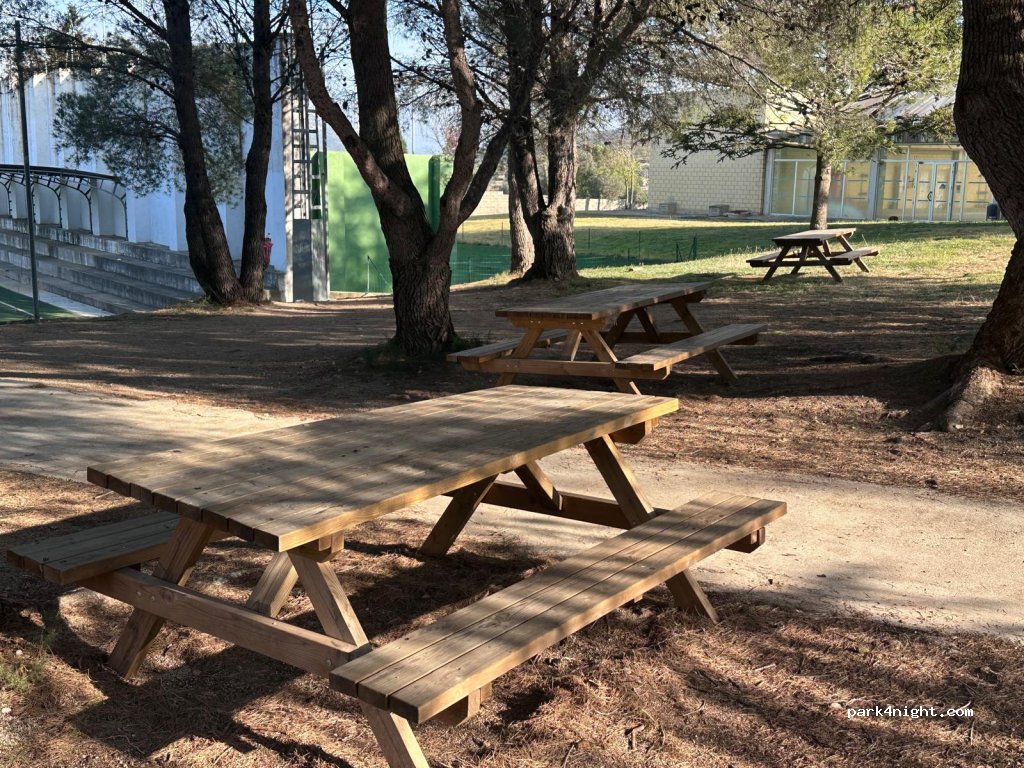 It has 8 places and a network of services for caravanning such as emptying gray and black water, supplying water and electricity through payment with tokens, which can be purchased at the sports center bar and picnic table area.