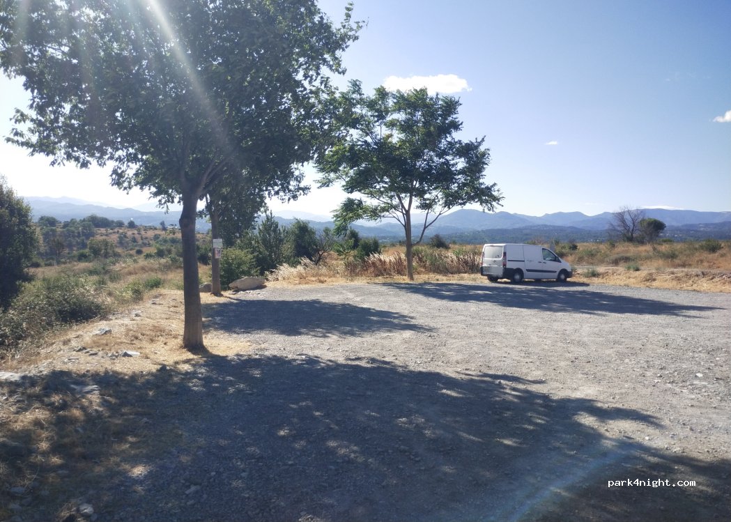Parking by the road with little traffic. It is furnished with a trash can and with a few trees around so a little shade. It is gravelled.
