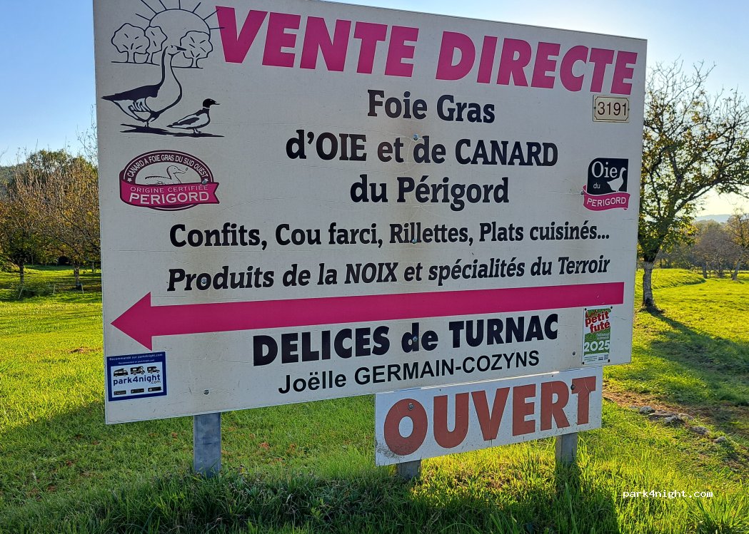 Accueil très sympathique avec dégustation de foie gras accompagnée d'un verre de vin blanc. Nuit très calme sur le parking du magasin. A ne pas confondre avec la ferme d'élevage un peu plus bas avec services.